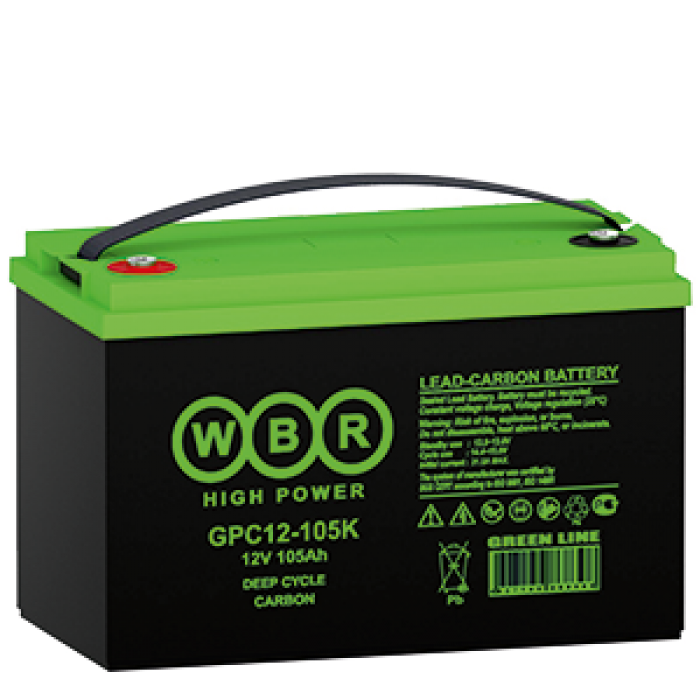 Аккумулятор WBR GPC12-105K - герметизированная, карбоновая, свинцово кислотная, аккумуляторная батарея со сроком службы 15 лет или более 1900 расчетных циклов заряда-разряда в циклическом режиме при 70% разряде. Эта высокоэффективная, перезаряжаемая батарея не требует обслуживания в течение всего срока службы и за счет использования чистого свинца, а также добавки углерода в состав электродов получили улучшенные зарядные и разрядные характеристики.