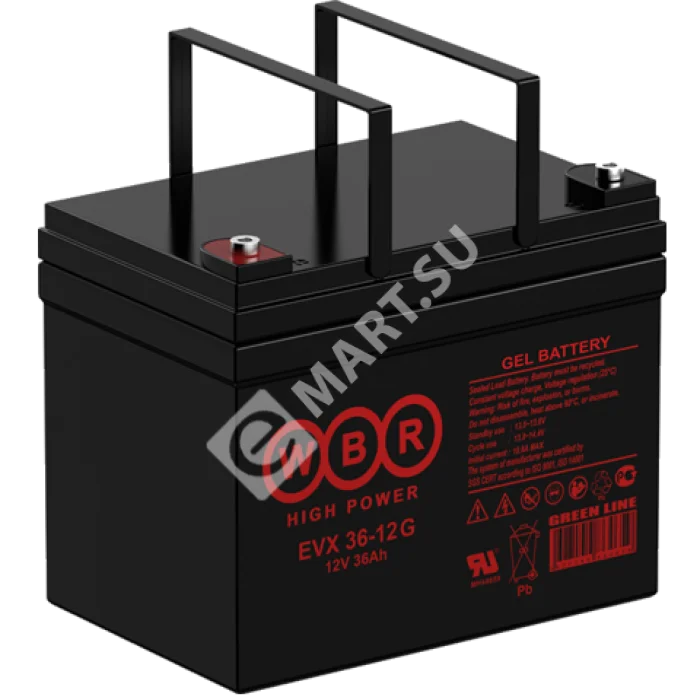 Аккумулятор WBR EVX36-12G - герметизированная, выполненная по гелевой (GEL) технологии, тяговая свинцово-кислотная аккумуляторная батарея. Обладает высоким качеством и надежностью, устойчива к глубоким разрядам и применяется для питания электрических транспортных средств, гольфкаров, газонокосилок, полотерных и поломоечных машин, медицинских колясок, электроинструмента, электронасосов, эхолотов, осветительных приборов, в том числе наружного освещения и другой техники.